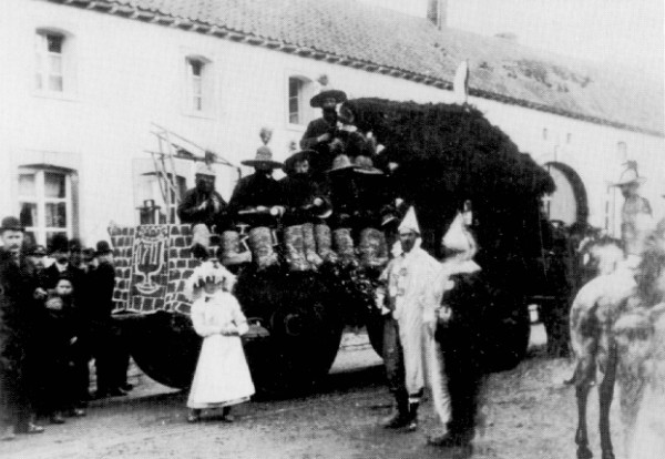 Reeds in 1904 werd in Gronsveld een carnavalsoptocht georganiseerd, in de volksmond "Cavalcade" geheten. De hier afgebeelde wagen is die van de "Panneleppers". De als clown geklede figuur, staande voor de kasteelingang, is Pieter Bouchoms. Het linkergedeelte van het huis op de foto bestaat niet meer.