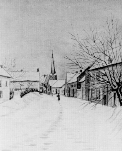 Emile van den Boorn, neef van de oud-burgemeester van Gronsveld, was een kunstzinnig man, Hij was niet alleen zeer muzikaal, ook als tekenaar heeft hij zijn sporen verdiend, getuige dit sfeervolle dorpsgezicht dat hij in 1892 vervaardigde. De huizen op de achtergrond zouden drie jaar later verwoest worden bij de grote brand die Gronsveld toen teisterde.