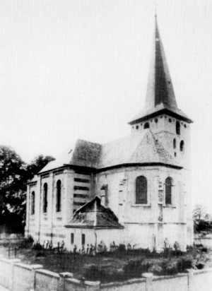 Deze foto toont ons de parochiekerk van Gronsveld voor de restauratie van 1895. U ziet dat het dak van de sacristie voor deze datum een geheel andere vorm had. De sacristie die tot dan toe van buitenaf niet bereikbaar was, kreeg toen een eigen toegangsdeur.