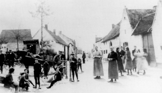 Veel is er in Rijckholt veranderd sinds de tijd dat deze opname werd gemaakt. Het bruggetje, de put links op de achtergrond... Fons Bemelmans houdt het paard bij de teugel vast. En voor goede opmerkers: geheel op de achtergrond zijn nog een paar paters dominicanen te onderscheiden.
