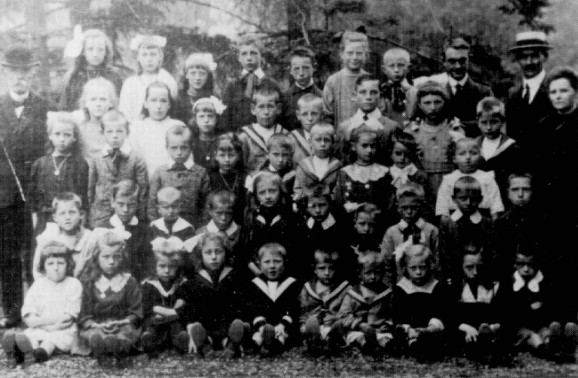 Het voltallige personeel van de lagere school te Gronsveld omstreeks 1922 met een gedeelte van hun pupillen. Links op de foto: meester Jenissen. Verder van links naar rechts: meester Bouchoms, meester Claessens en juffrouw Schuren. Wie de kinderen van deze kinderen kent, zal het met ons eens zijn: ook het Gronsvelder Klumpke valt niet ver van de boom.